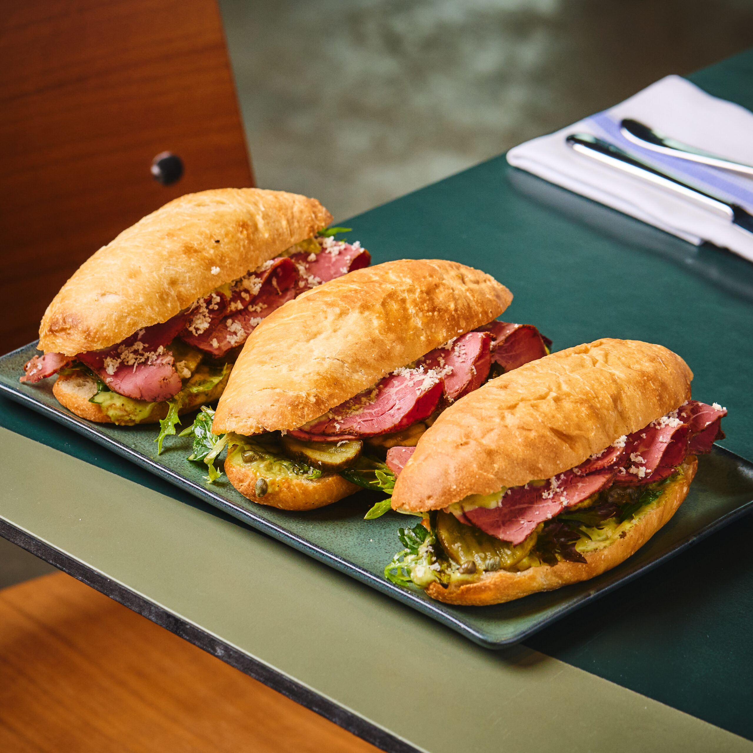 Ciabatta med roastbiff, hjemmelaget remulade, sylteagurk, pepperrot og salat.